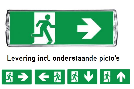 Escalight noodverlichting LED transparant opbouw inclusief 4 picto's. Dit waterdichte (IP65) opbouw noodverlichtingsarmatuur heeft een witte behuizing en een heldere, slagvaste polycarbonaat kap. Het armatuur is uitgevoerd met testknop, led indicator en 3 uurs accu. De bulkhead wordt compleet geleverd met wartel en pictogramstickers man pijl links, rechts, boven en beneden (zichtbereik 24m). Dankzij de multifunctionele elektronica is het armatuur zowel maintained als non-maintained te gebruiken. De bulkhead kan tevens worden toegepast als portiekverlichting.| Aantal | Prijs per stuk |